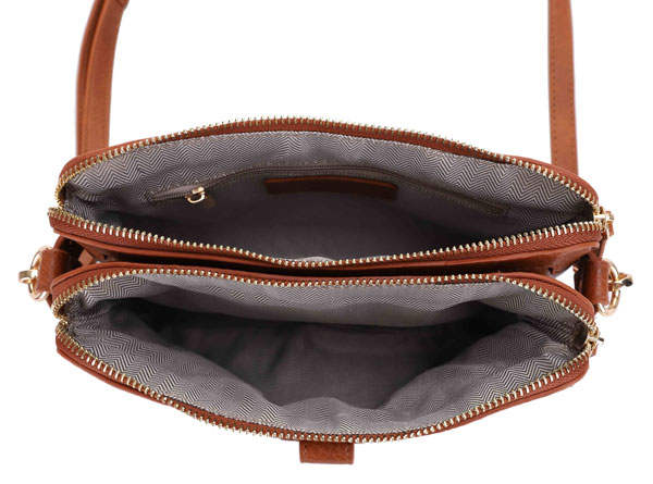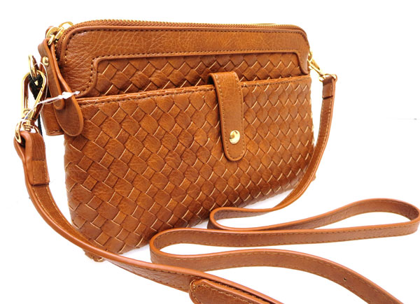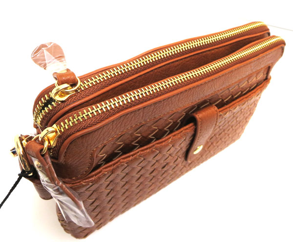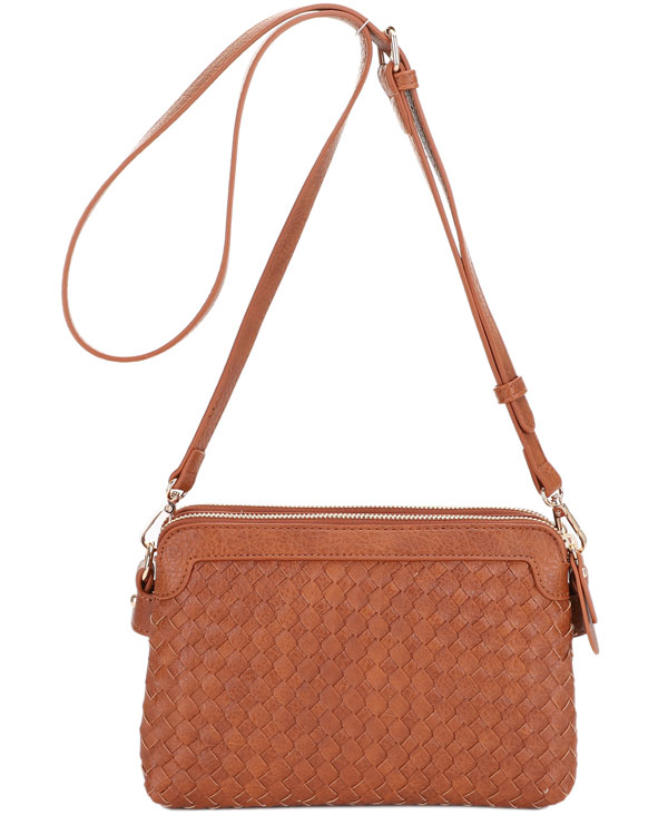 woven crossbody/ 2 top zip closure & middle pocket