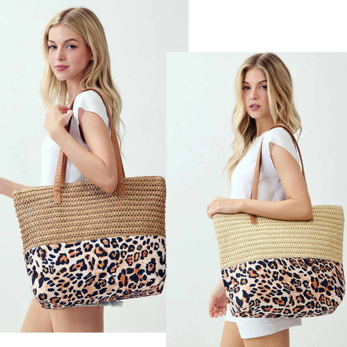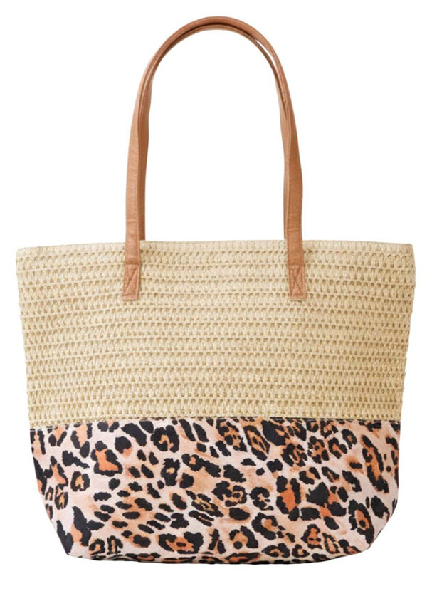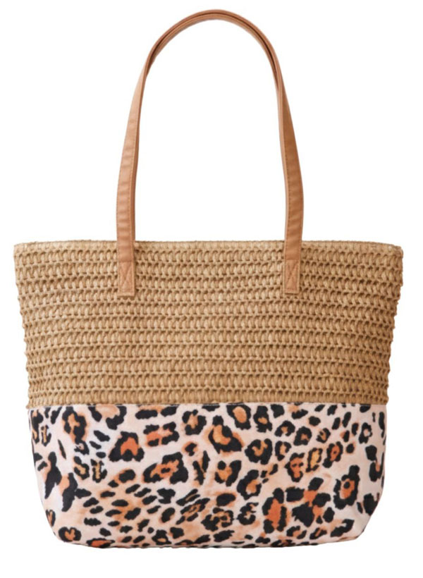 Straw tote bag with leopard print fabric