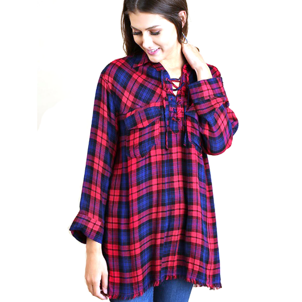 Plaid Fringe Hem Tunic with a Drawstring Neckline
